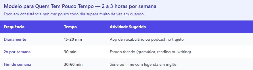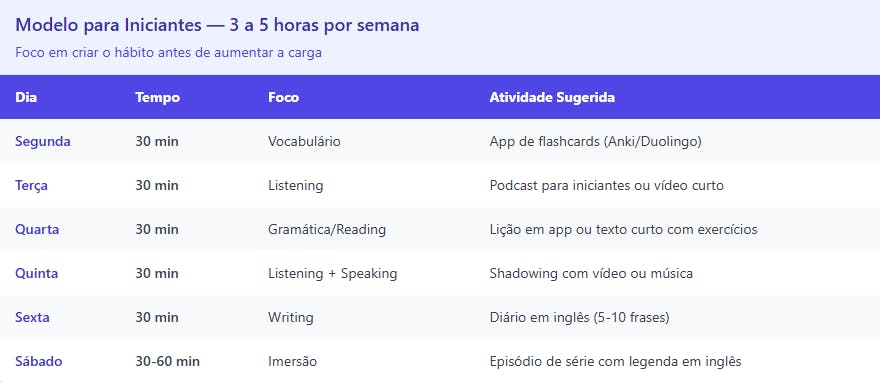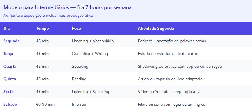 Distribua as habilidades ao longo da semana. Exemplo: segunda e quarta foco em listening, terça e quinta em reading e writing, sexta em speaking. Isso garante que nenhum pilar fique abandonado.
